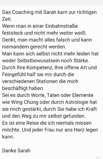 “Das Coaching mit Sarah war für mich eine ganz besondere Erfahrung, da sie auch auf meinen Wunsch eingegangen ist die Astrologie mit einzubringen. Ich konnte ganz ich selbst sein, wurde einfühlsam aufgenommen und habe wertvolle Impulse mitgenommen. Sarah begleitet sehr liebevoll und individuell. Gleichzeitig hat sie mir Denkanstöße gegeben, die mich noch lange nach der Sitzung begleitet haben. Danke!”